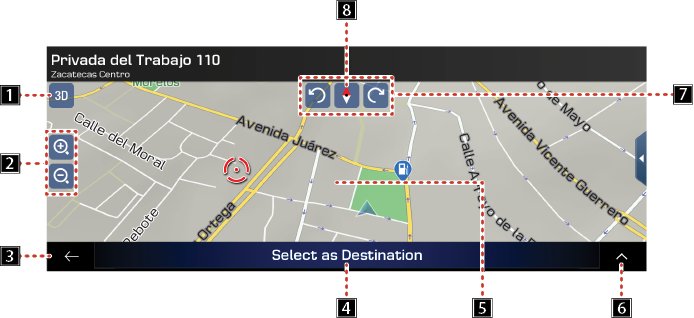 Cambia entre los modos de vista del mapa Perspectiva en 3D, 2D dirección arriba y 2D norte arriba. En el modo Dirección arriba, el mapa se gira para que la parte superior siempre apunte en la dirección de conducción actual. Esta es la orientación predeterminada en el modo de visualización de mapa en 3D. En el modo Norte arriba, el mapa se orienta hacia el norte.