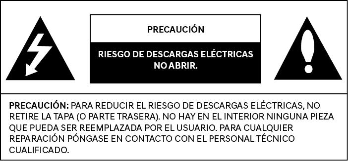 Para reducir el riesgo de descargas eléctricas, no retire la cubierta o la parte posterior de este producto. No contiene partes que el usuario pueda reparar. Llévelo a servicio con el personal calificado.